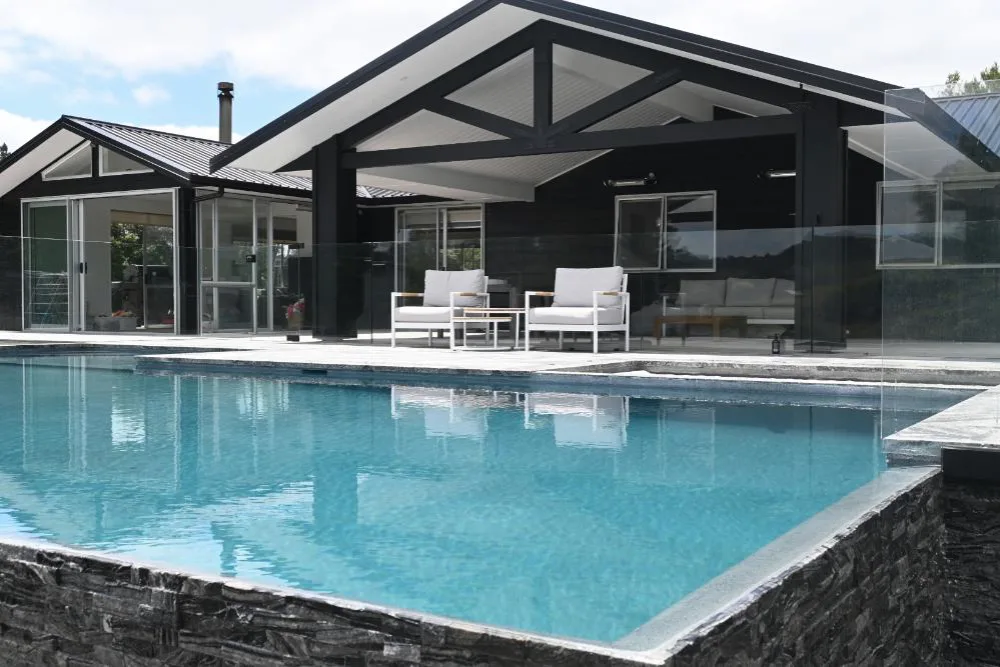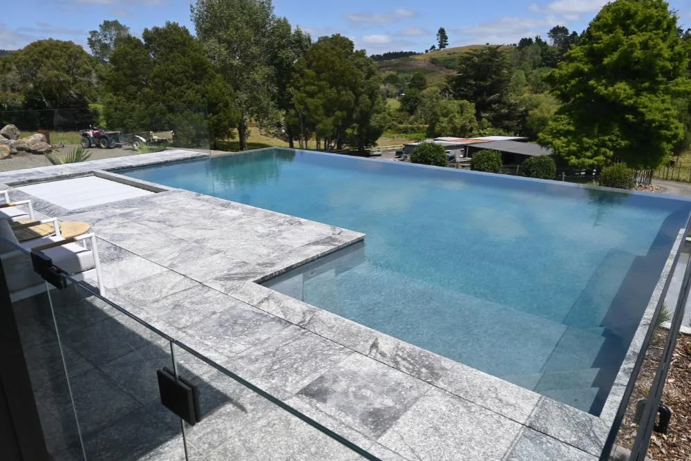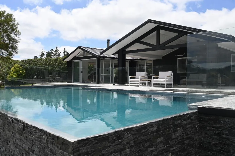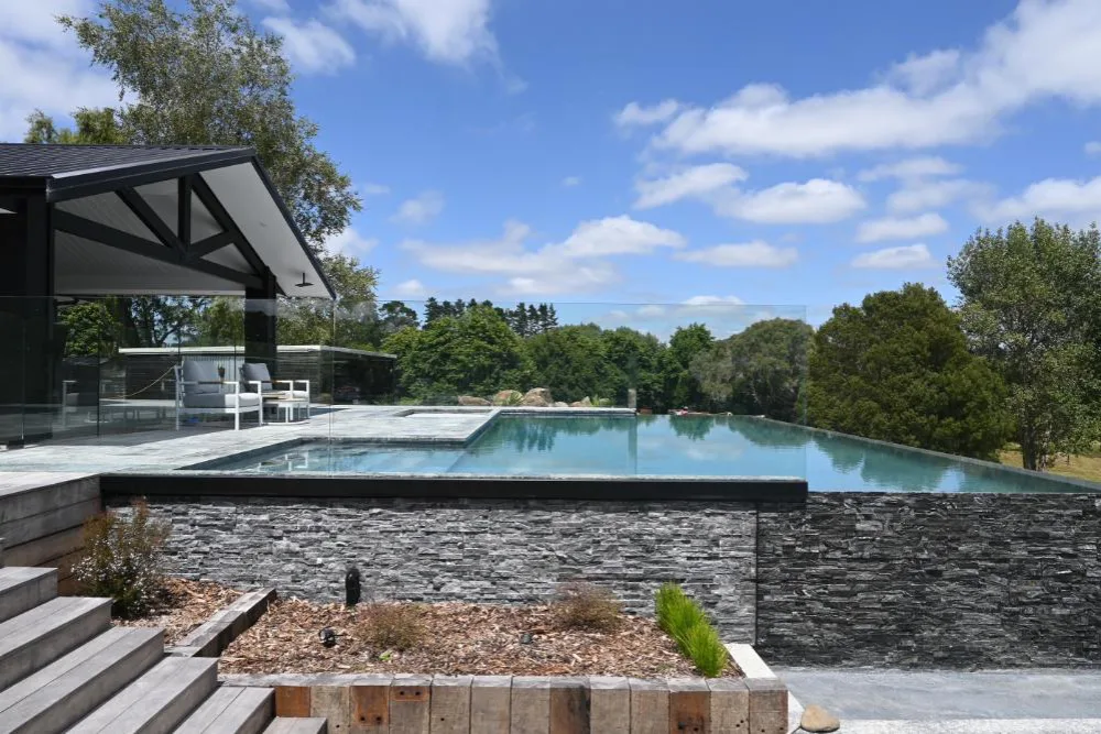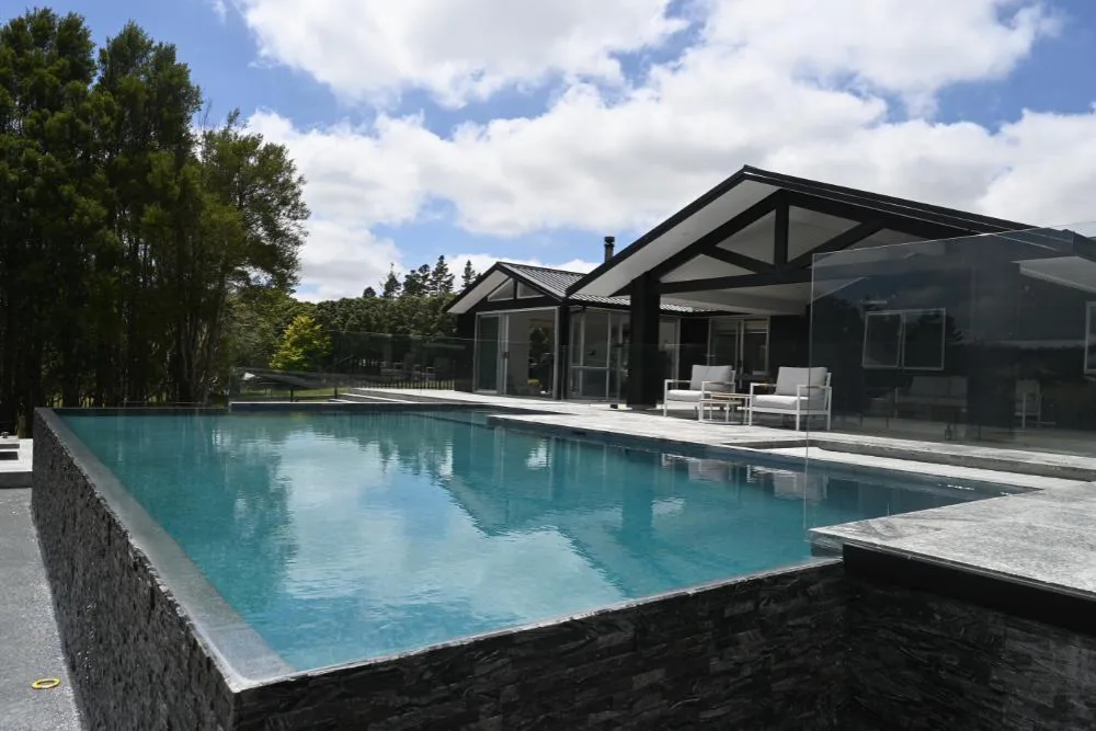 This stunning 10m x 5m pool has an infinity edge wrapped around two sides, an adjacent spa with automatic cover and a beautiful glass balustrade leading onto the covered wooden deck. The surrounding stone tiles bring a gorgeous natural look to the project, with the cascading water visible as you drive up to the property. This was plastered using NZ Pool Pebble in a custom a mix of Waihau Bay and Kaikoura, bringing both blue and grey tones to the pool, creating a stunning water colour.